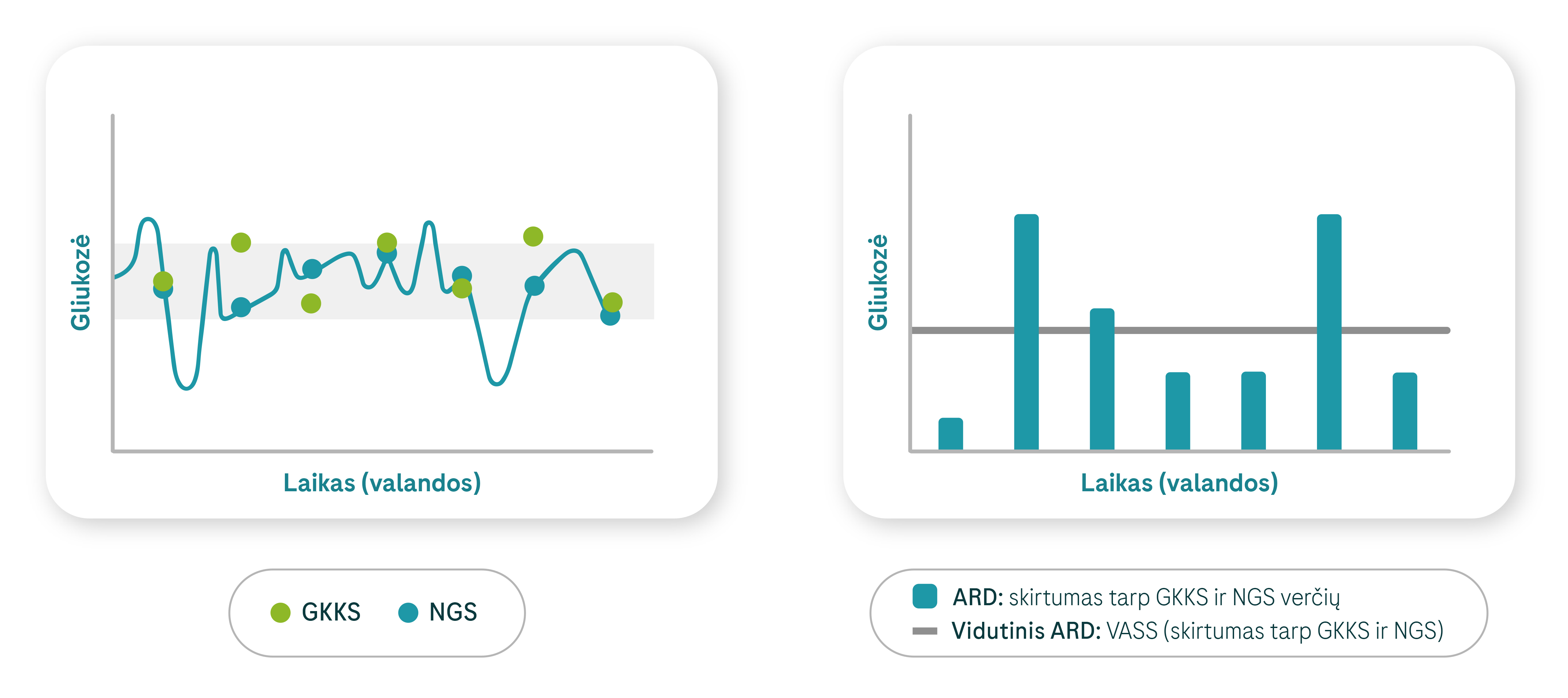 Skaičiuojant VASS, reikia patikrinti, ar tiksli jūsų gliukozės stebėsenos priemonė. Tikslumas matuojamas lyginant cukraus kiekio kraujyje rodmenis, gautus stebėsenos priemone, su patikimu pamatiniu metodu, paprastai laboratoriniu cukraus kiekio kraujyje tyrimu arba gliukozės kiekio kraujyje piršto kraujo ėmimo tyrimu. Apskaičiuojamas skirtumas tarp pamatinės vertės ir NGS rodmens. Tada skirtumas tarp NGS vertės ir nuorodos paverčiamas procentais. Remiantis šių procentinių dalių vidurkiu gaunamas vidutinis absoliutus santykinis skirtumas (VASS).